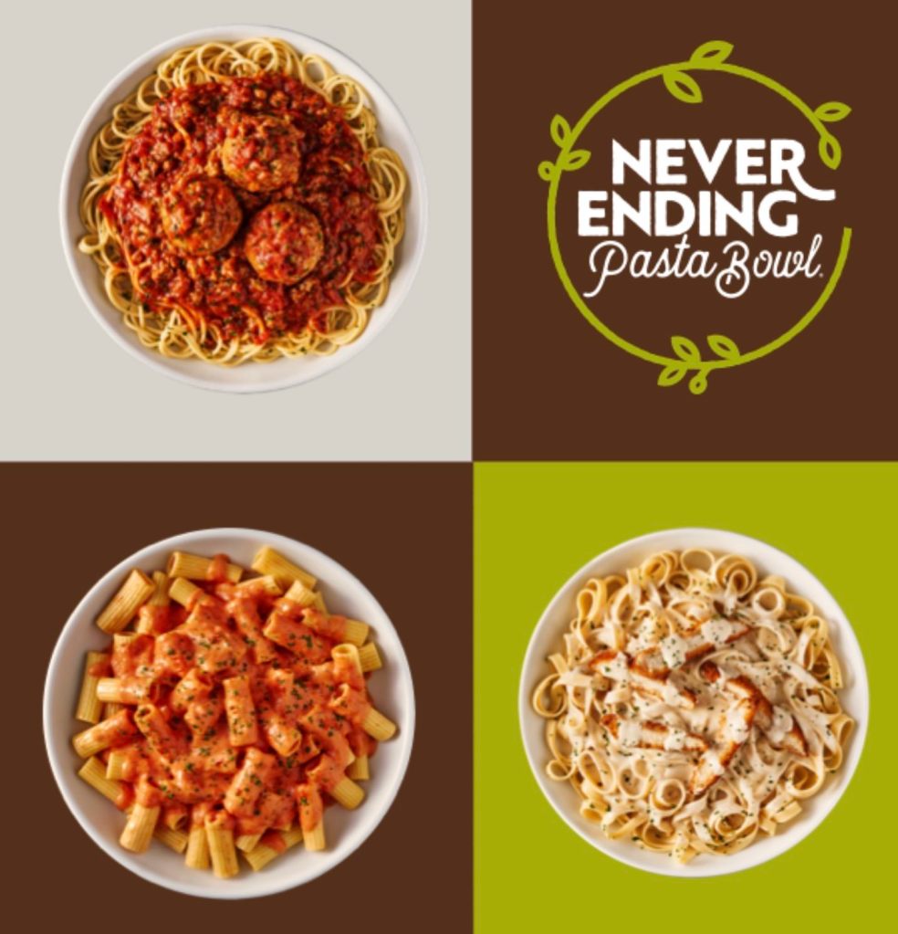 Customers can enjoy a selection of various pastas, sauces and proteins that add up to 80 different pasta-bilities of combinations — and include unlimited soup or salad and Olive Garden’s famed breadsticks.