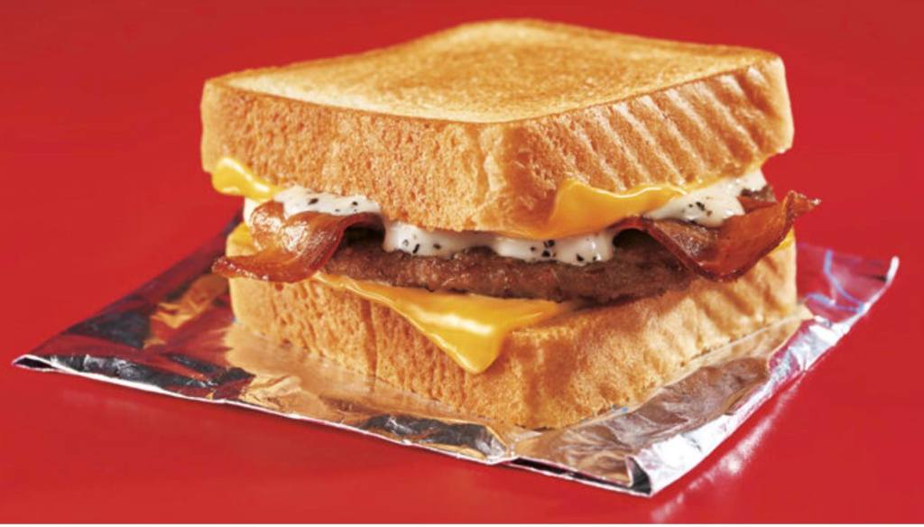 The new Bacon Peppercorn Ranch Grilled Cheese Burger features a 100 percent all-beef seasoned patty, hickory-smoked bacon and creamy Peppercorn Ranch sauce, all layered between melty American cheese and buttery Texas Toast.