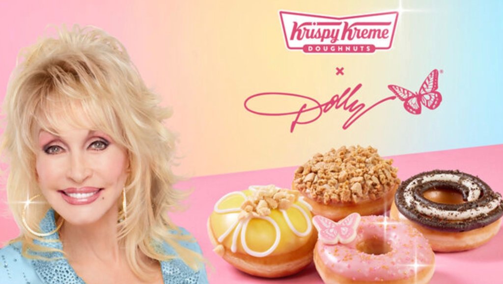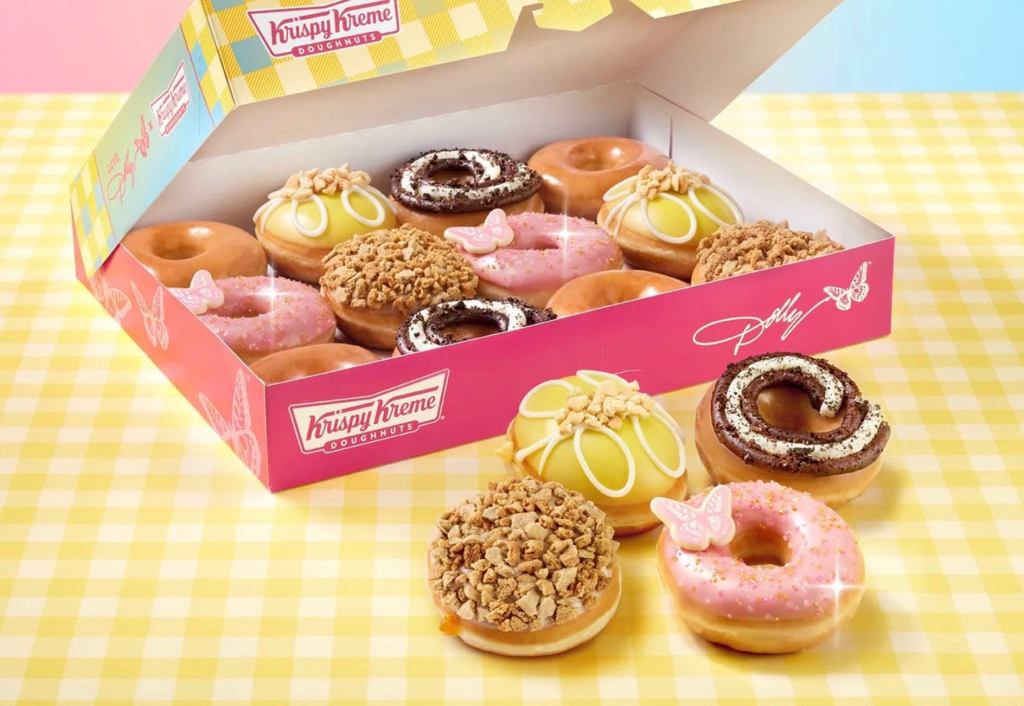 - Dolly Dazzler Doughnut: An Original Glazed Doughnut coated in strawberry icing, adorned with gold, pink, and white glitter sprinkles, and crowned with a signature chocolate Dolly butterfly piece.