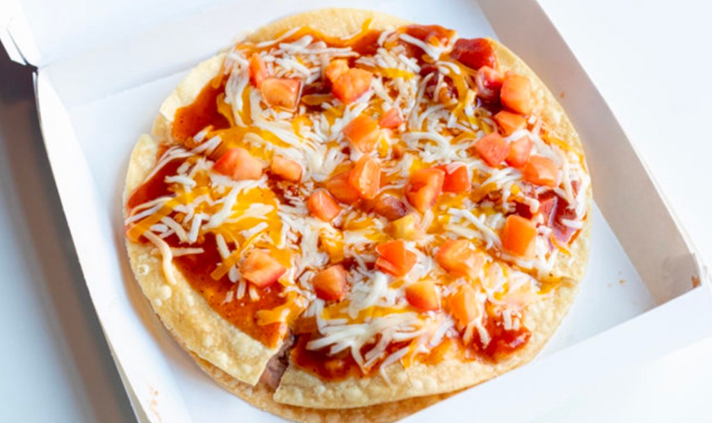 The Mexican Pizza features two crispy flour shells, layered with beans, pizza sauce, seasoned beef, tomatoes and a melted three cheese blend all for a suggested price. You can also get it vegetarian without the seasoned beef.