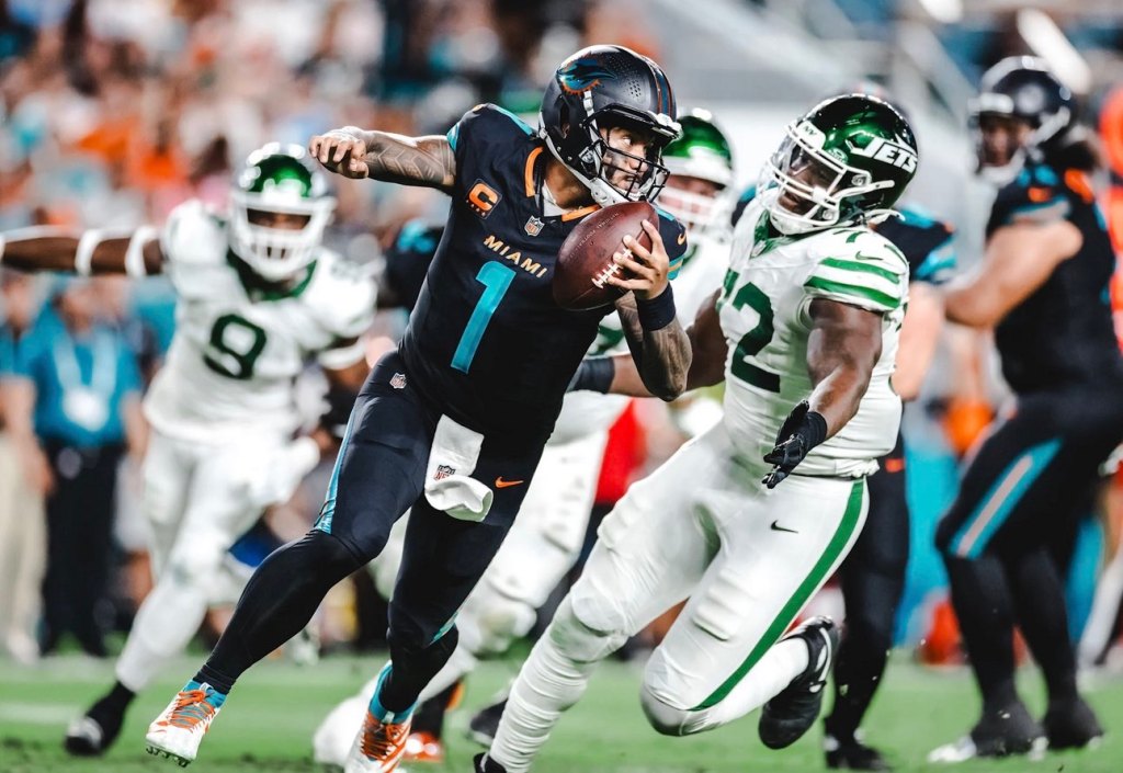 All in all, Fields completed 20-of-27 passing attempts for 226 yards and a touchdown. The stats are somewhat misleading. Most of Fields’ passing production occurred in the fourth quarter with the Jets trailing by multiple scores, with the Dolphins playing a conservative prevent defense.