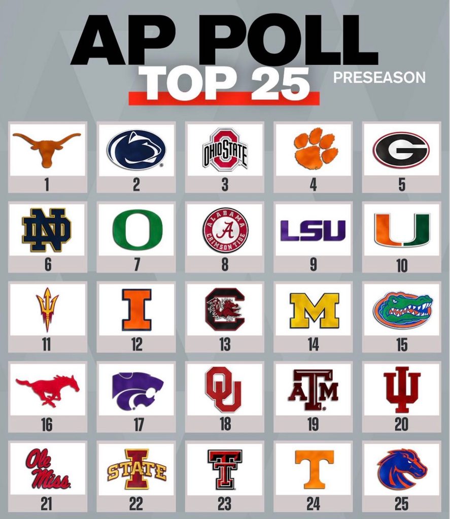 The Texas Longhorns will start the 2025 college football season as the No. 1 ranked team in the nation, according to the Associated Press‘ Preseason Top 25 College Football Poll.